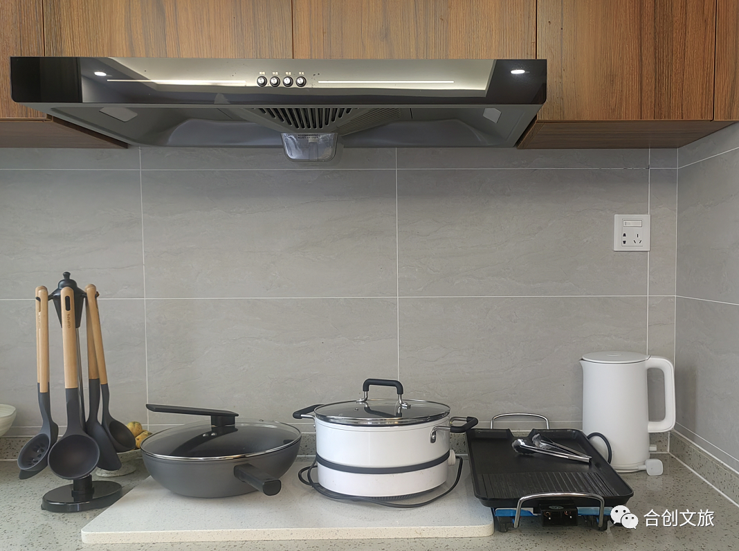 别墅内厨房配备:一小冰箱,一炒锅,一煮锅,一电磁炉,一电烤炉(人多建议自备);